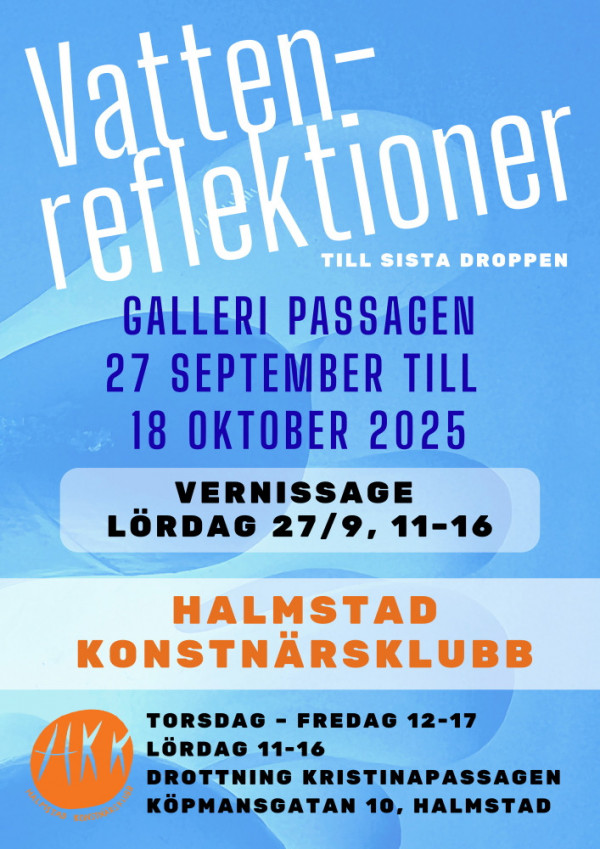 Jag deltar i "Vattenreflektioner - till sista droppen" med 10 medlemmar ur Halmstad Konstnärsklubb.